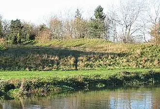 Castle Hills is a Norman ringwork castle overlying part of a late Saxon vill and medieval village which was deserted, at least in part, to make way for the stronghold. The ringwork was used subsequently as the site of a windmill. The monument is situated on a gravel terrace on the west bank of the River Great Ouse. The ringwork has a bailey on its north side and is surrounded to the west by a ditch enclosing an outer court. The ringwork itself is irregular in plan... A waterfilled ditch 15-20m wide by 1.5m deep runs along the western and southern sides and a slightly shallower 10m wide dry ditch separates the stronghold from the bailey on the northern side. There is a narrow causeway across the junction of these ditches at the north-west.[1]