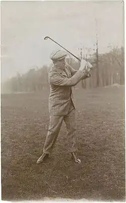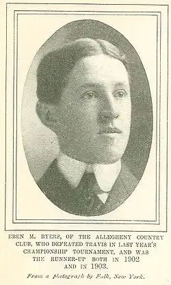 The son of industrialist Alexander Byers, Eben Byers was educated at St. Paul's School and Yale College.[1] He earned a reputation as a sportsman and played on the Yale Bulldogs golf team. Byers was the U.S. Amateur golf champion of 1906,[2] after finishing runner-up in 1902 and 1903.[3][4] Byers eventually became the chairman of the Girard Iron Company, which had been created by his father.[1]