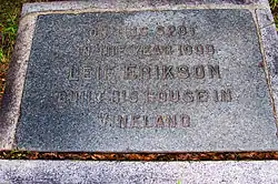 Horsford became interested in the theory that the Vikings, specifically Leif Ericson, had visited North America, and set out to prove it.[10][11][12] He connected the Charles River Basin to places described in the Norse sagas, invented Old Norse etymologies for Algonquian place-names like Naumkeag, Namskaket, and Amoskeag, and claimed to have found Viking archaeological remains. Robin Fleming wrote that these included an assertion that he found "an elaborately engineered system of Viking waterways throughout Boston, constructed to support the industrial efforts of the Norse settled in New England, who produced, for three centuries, thousands of tons of wooden drinking cups."[13][14] Horsford had a plaque documenting all this placed on Memorial Drive near Mount Auburn Street in Cambridge, Massachusetts. A few miles upstream, at the mouth of Stony Brook, he had Norumbega Tower built marking the supposed location of Norumbega, a Viking fort and city, complete with its Althing and America's first Christian bishop.[13] He also commissioned a statue of Leif Ericson that stands on Commonwealth Avenue in Boston. The professor wrote a series of books, articles, and pamphlets about the Vikings' visits to Massachusetts. After his death, his daughter Cornelia Horsford took up the cause. Their work received little support from mainstream historians and archeologists at the time, and even less today.[8][15][16]