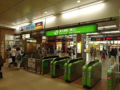 Ebisu Station (恵比寿駅, Ebisu-eki) is a railway station in the Ebisu neighborhood of Tokyo's Shibuya ward, operated by East Japan Railway Company (JR East) and the Tokyo subway operator Tokyo Metro. The station is named after Yebisu Beer, which was once brewed in an adjacent brewery, and which is itself named for the Japanese deity Ebisu.