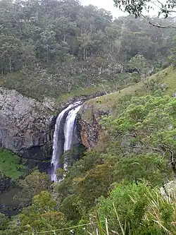 The first lookout is on a sealed road, approximately 200 metres (660 ft) off the Waterfall Way. This viewing platform shows the upper falls tumbling 115 metres (377 ft) over 4 layers of columned basalt rock in two falls. The lower Ebor falls, 600 metres (2,000 ft) further on, plunge over Permian sedimentary rocks into a steep forested gorge below.[1]