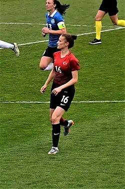 In 2012, she scored one of the three goals for the Turkey women's U-19 team against the team from Ukraine at the International Kuban Spring Tournament.[2] She shot two goals at the 2014 UEFA Women's Under-19 Championship qualification against Montenegro.[4] On November 28, 2013, she scored the third goal for Turkey in the 2015 FIFA Women's World Cup qualification – UEFA Group 6 match against Montenegrin team that ended with 3–1.[24][25]