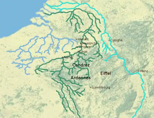 According to a description given by Caesar (mid-1st century BC), the greatest part of the Eburones lived between the Meuse and Rhine rivers.[17] However, Caesar also notes that their land bordered on that of the coastal Menapii in the north, and that those among the Eburones "who were nearest the ocean" managed to hide in islands after their defeat against the Romans.[18] This apparent geographical situation, near both the Condroz region and the Rhine–Meuse delta, has suggested to many scholars that a significant part of their territory stretched west of the Meuse rather than between the Meuse and the Rhine.[19][20][21] For instance, Johannes Heinrichs (2008) contends that a territory stretching from the Rhine to the North Sea would be "unrealistically large", especially since they were portrayed as clients of the neighbouring Atuatuci until 57 BC. Since archaeological findings suggest that the Eburonean territory did not extend substantially east of the Meuse in the direction of the Rhine, Heinrichs argues that their territory was rather principally centred in an area located west of the Meuse.[21]