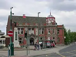 In addition to the Liverpool and Manchester Railway, the town is now served by the Eccles Line of the Metrolink light rail system which, along with regular bus services, terminates at Eccles Interchange.[92] Work on the Metrolink branch to Eccles began in July 1997 and was completed by July 2000, with the official opening ceremony in January 2001;[93] trams leave every twelve minutes.[94]