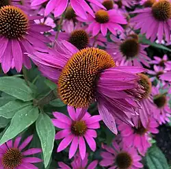 Many species of Echinacea are cultivated for commercial use,[16] while others, notably E. purpurea, E. angustifolia, and E. pallida, are grown as ornamental plants in gardens.[24] Many cultivars exist, and many of them are asexually propagated to keep them true to type.