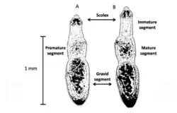 Echinococcus shiquicus is a parasitic worm first identified in 2005.[1] It was found in Tibetan foxes in the Qinghai–Tibet plateau region. Two types of adult worms were recovered and the variant which had a short strobila consisting of single immature and single gravid segments constituted the majority of the specimens. The strobila, rostellar hooks, location of the genital pore and the number of eggs in gravid uterus helped in differentiating Echinococcus shiquicus from the other species. The metacestode of E. shiquicus was detected exclusively from plateau pikas. The larvae are unique and they develop into unilocular minicysts approximately 1 cm in diameter within the liver or lungs.[2]