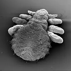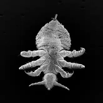 Lice in this family have a chaetotaxy characterized by three kinds of setae: spines, scales, and hairs. Different species have different arrangements of these setae. Species also have various egg-laying habits, with some laying them singly or in clusters, and some cementing them to the hairs of the host animal.[2] These lice have antennae but no eyes. In most species the middle and rear pairs of legs are larger with blunt claws while the front pair of legs is smaller with pointed claws.[3] Scanning electron microscope examination shows that the species Antarctophthirus microchir uses its larger middle and rear pairs of legs to cling to the hairs of its host, and the smaller, pointed front legs are probably sensory structures.[2]