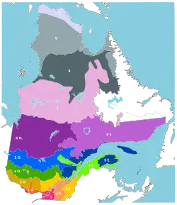 The Quebec Ministry of Forests, Wildlife and Parks divides Quebec into three vegetation zones: northern temperate, boreal and Arctic, which correspond to Quebec's major climate subdivisions, and divides these into sub-zones, which in turn are divided into domains and sub-domains.[2] The ministry publishes a map in which these sub-domains are in turn divided into ecological regions and subregions, and then into landscape units. (See Saucier, J.-P.; Robitaille, A.; Grondin, P.; Bergeron, J.-F.; Gosselin, J. 1998)