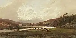 At this distance, however, the aspect of the country begins rapidly to improve. The forest is less thick, and the trees in general are of another description; the iron barks, yellow gums, and forest oaks disappearing, and the stringy barks, blue gums, and box trees, generally usurping their stead. When you have advanced about 4 mi (6.4 km) further into the interior, you are at length gratified with the appearance of a country truly beautiful. An endless variety of hill and dale, clothed in the most luxuriant herbage, and covered with bleating flocks and lowing herds, at length indicate that you are in regions fit to be inhabited by civilized man. The soil has no longer the stamp of barrenness. A rich loam resting on a substratum of fat red clay, several feet in depth, is found even on the tops of the highest hills, which in general do not yield in fertility to the valleys. The timber, strange as it may appear, is of inferior size, though still of the same nature, i. e. blue gum, box, and stringy bark. There is no underwood, and the number of trees upon an acre do not upon an average exceed thirty. They are, in fact, so thin, that a person may gallop without difficulty in every direction.[15]