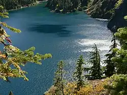 The mid-elevation forests in the North Cascades with an elevation between 2,000 and 4,300 feet (600 and 1,300 m) is the Silver Fir Ecoregion.[6] The Silver Fir Ecoregion makes up for much of the valleys in the Alpine Lakes area. The average annual temperature in this ecoregion is 42 °F (6 °C) and the average precipitation in centimeters is between 220 and 280 centimetres (87 and 110 in).[8] Typical montane forests in this ecoregion is dominated by Pacific silver fir and also contains noble fir, Douglas fir, and Alaska yellow-cedar.[6][8] Coarse woody debris is very characteristic of the Silver Fir Ecoregion, providing microsites for organisms. The Pacific silver fir zone is in some of the steepest parts of the topography and heavy snow often leads to avalanche gullies.[6] In every major drainage basin along the western slopes of the Cascade Mountains there is evidence of avalanche tracks breaking up the forested vegetation with nonforested vegetation.[6] These gullies provide sites of new successional growth as they move toward a coniferous forest again.[6] Because of the dense forests of the Silver Fir Ecoregion, it was the preferred area for commercial logging prior to designation of areas as wilderness.