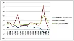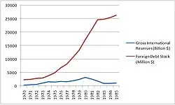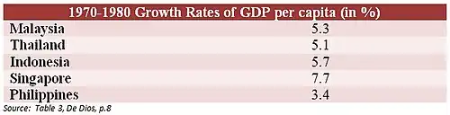 After experiencing years of positive growth, the Philippine economy between 1973 and 1986 suffered a downturn due to a mixture of economic mismanagement and political instability amidst a global economic recession. After the 1972 Martial Law declaration, Marcos continued his strategy of relying on international loans to fund the projects that would support the booming economy, prompting later economists to label this a period of "debt driven" growth.[73] Massive lending from commercial banks, accounting for about 62% percent of external debt, allowed the GDP of the Philippines to rise during martial law.[74] Much of the money was spent on pump-priming to improve infrastructure and promote tourism. However, despite the aggressive borrowing and spending policies, the Philippines lagged behind its Southeast Asia counterparts in GDP growth rate per capita. The country, in 1970–1980, only registered an average 5.73 percent growth, while its counterparts like Thailand, Malaysia, Singapore, and Indonesia garnered a mean growth of 7.97 percent.[68] This lag, which became very apparent at the end of the Marcos Regime, can be attributed to the failures of economic management that was brought upon by State-run monopolies, mismanaged exchange rates, imprudent monetary policy and debt management, all underpinned by rampant corruption and cronyism.[68]