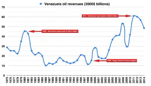 The Chávez government overspent in social spending, however, and did not save enough money for any future economic difficulties.[4] On 31 March 2000, Chávez initiated policies that resulted with the Venezuelan government spending more than it received as oil prices began to rise.[33] Poverty in Venezuela began increasing going into the 2010s.[34] During Chávez's campaign before the 2012 presidential election, he tripled Venezuela's deficit while on a "spending spree".[35] In 2014 El Universal reported that in the previous five years that included years under Chávez's policies, purchasing power for those with minimum wage jobs had dramatically decreased compared to other countries in the region, supposedly due to the high inflation rate and the multiple devaluations of Venezuela's currency.[36]
