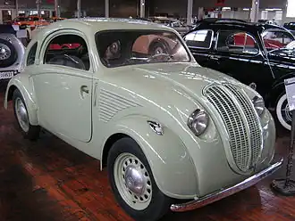 From 1936 to 1955, Fiat in Italy produced the advanced and very compact FR layout Fiat 500 "Topolino" or "little mouse", the precursor of the 1950s Fiat 500, it was designed by Dante Giacosa. The inline four cylinder 569 cc 13+1⁄2 hp engine was placed right at the front of the chassis with the radiator behind it. This allowed for a sloping front and good legroom when combined with lowered seating. This also allowed Fiat to lower the roofline.[49] Although nominally a two-seater more were often squeezed in behind the seats. Initially it had quarter elliptic leaf spring rear suspension, but with an axle locating trailing arm, that was upgraded to stronger semi-elliptic to cope with overloading by customers. The front suspension was independent and was used as the basis of the suspension of the first English Cooper racing cars in the 1940s that became successful in the 1950s.[50] It had a four speed gearbox (when three was common) and all hydraulic brakes.[51] It was a similar size to the Austin Seven but much more advanced. It was exported all over the world and produced at the NSU factory in Germany, Steyr-Puch in Austria and Simca in France.[52] It was facelifted with American influenced 'full width styling' of the frontal panels after the war, with headlights integrated into the wings/fenders.