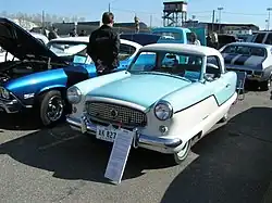 While economy cars flourished in Europe and later Japan, the booming postwar American economy combined with the emergence of the suburban and interstate highways in that country led to slow acceptance of small cars. Brief economic recessions saw interest in economical cars wax and wane. During the early 1950s, the independent lower volume American auto manufacturers launched new 'small' cars. They were designed to be smaller than contemporary American cars, but would still have mainstream appeal, because they could still accommodate five passengers comfortably with conventional engineering and FR layout, establishing the American sized 'Compact car'. Nash Motors launched the Nash Rambler and Kaiser-Frazer introduced the Henry J in 1950. Willys-Overland (the designers of the Second World War Jeep MB) the Willys Aero in 1952, and Hudson the 1953 Hudson Jet.[76] This niche market avoiding competition with the 'Big Three' of GM, Ford and Chrysler was not large enough to sustain all these competing models.[76] They were priced too near the cost of a base model full sized car from the big three, that in the 1950s had a price war. US Fuel prices during this period were very low and the maintenance costs of the compacts were almost as much as full sized cars, so total running cost were not that much cheaper.[76] Only the Nash Rambler made it to a second generation. The losses caused to the other car makers initiated the succession of mergers that eventually resulted in the American Motors Corporation (AMC).[76] Nash also contracted with British Motor Corporation to build the American designed Metropolitan using existing BMC mechanical components, (the 1.5 Liter engine is a BMC B-Series engine also used in larger sizes in the MG MGA and MG MGB). Imported cars began to appear on the U.S. market during this time to satisfy the demands for true economy cars. An initial late 1940s–early 1950s success in a small way, was the monocoque Morris Minor launched in 1948, with its miniaturized Chevrolet styling. It was underpowered for the long distance roads of the U.S. and especially the freeways that were starting to spread across the country in the 1950s. The first British Motorway did not open until 1959. BMC preferred to develop the higher profit margin MGs for the American market and also worked with Nash and so passed on the opportunity. From the mid-1950s the Volkswagen Beetle using clever and innovative advertising and capitalising on its very high build quality, durability and reliability, was a spectacular success. Having been designed for cruising the autobahns, freeways were no problem for it. It disproved the scepticism of American buyers as to the usefulness of, by their standards, such small cars. In 1955 VW launched the Beetle-based Italian styled Karmann Ghia coupé, that was developed from a 1953 concept car. Production doubled soon after its introduction,[77] becoming the car most imported into the U.S,[77] with more than 445,000 imported.[78] Initially the stylish Renault Dauphine derived from the Renault 4CV, looked like it would follow the VWs footsteps, but then was a failure due to mechanical breakdowns and body corrosion. This failure on the U.S. market in the late 1950s, may have harmed the acceptance of small cars generally in America.[79]