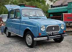 The 4CV was designed covertly by Renault engineers during the World War II German occupation of France, when under strict orders to design and produce only commercial and military vehicles. Between 1941 and 1944, Renault was under the Technical Directorship of a francophile German installed former Daimler Benz engineer called Wilhelm von Urach who turned a blind eye to the small, economy car project suitable for the period of post war austerity.[60] The design team went against the wishes of Louis Renault who in 1940 believed that post-war Renault should concentrate on mid-range cars.[60][61] Only after a row in May 1941 did Louis Renault approve the project.[60] In October 1944 after the liberation, Louis Renault who was imprisoned on charges of collaboration, died in suspicious circumstances. In January 1945, newly nationalised Renault had officially acquired a new boss, the former resistance hero Pierre Lefaucheux, (he had been acting administrator since September 1944). Lefaucheux had been arrested by the Gestapo in June 1944, and deported to Buchenwald concentration camp. The Gestapo transferred him to Metz for interrogation, but the city was deserted because of the advancing allied front, the Germans abandoned their prisoner. In November 1945 the French government invited Ferdinand Porsche to France looking to relocate the Volkswagen project as part of war reparations.[62] On 15 December 1945, Porsche was invited to consult with Renault about the Renault 4CV. Lefaucheux was enraged that anyone should think the almost production-ready Renault 4CV was in any way inspired by the German Volkswagen, and that the politicians should presume to send Porsche to advise on it. The government insisted on nine meetings with Porsche which took place in rapid succession. Lefaucheux insisted that the meetings would have absolutely no influence on the design of the Renault 4CV, and Porsche cautiously went on record saying that the car would be ready for large scale production in a year.[63] Lefaucheux was a man with contacts, as soon as the 4CV project meetings had taken place, Porsche was arrested in connection with war crimes allegations involving the use of forced labour including French in the Volkswagen plant in Germany. Ferdinand Porsche, despite never facing any sort of trial, spent the next twenty months in a Dijon jail. The 760 cc rear-mounted four-cylinder engine, three-speed manual transmission 4CV was launched at the 1946 Paris Motor Show and went on sale a year later.[64] Volume production with the help of Marshall Plan aid money, was said to have commenced at the company's Parisian Boulogne-Billancourt plant a few weeks before the Paris Motor Show of October 1947, although the cars were in very short supply for the next year or so.[65] On the 4CV's launch, it was nicknamed "La motte de beurre" (the lump of butter); this was due to the combination of its shape and the use of surplus paint from the German Army vehicles of Rommel's Afrika Korps, which were a sand-yellow color.[66]