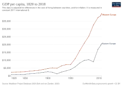 Following World War II, European governments were in tatters. Many non-Socialist European governments moved to integrate their economies, laying the foundation for what would become the European Union.[33] This meant a huge increase in shared infrastructure and cross-border trade. Whilst these European states rapidly improved their economies, by the 1980s, the state-run economies of the COMECON group were struggling, mainly due to the massive cost of the Cold War. The GDP and the living standards of Central and Eastern European states were lower than in other parts of Europe.[34]