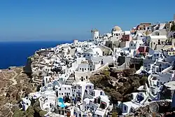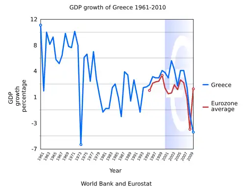 World War II (1939–1945) devastated the country's economy, but the high levels of economic growth that followed from 1950 to 1980 have been called the Greek economic miracle.[53] From 2000 Greece saw high levels of GDP growth above the Eurozone average, peaking at 5.8% in 2003, 5.4% in 2004 and 6.4% in 2006.[54] The subsequent Great Recession and Greek government-debt crisis, a central focus of the wider euro area crisis, plunged the economy into a sharp downturn, with real GDP growth rates of −4.1% in 2009, −5.7% in 2010, −9.9% in 2011, −8.3% in 2012 and −2.3% in 2013.[54] In 2011, the country's government debt reached €356 billion (172% of nominal GDP).[55] After negotiating the biggest debt restructuring in history with the private sector, which sustained losses in the order of €100 billion for private bond investors,[56] Greece reduced its sovereign debt burden to €280 billion (137% of GDP) in the first quarter of 2012.[57] Greece achieved a real GDP growth rate of 0.8% in 2014—after five consecutive years of economic decline—but the economy contracted by 0.2% in 2015 and recorded zero growth in 2016.[54][58] The country returned to modest growth rates of 1.5% in 2017, 2.1% in 2018 and 2.3% in 2019.[54] GDP contracted by 9.2% in 2020 during the global recession caused by the COVID-19 pandemic.[54] However, the economy rebounded by 8.7% in 2021, 5.7% in 2022, 2.3% in 2023 and 2.3% in 2024.[54][59] On 20 August 2022, Greece formally exited the EU's "enhanced surveillance framework", which had been in place since the conclusion of the third bailout programme exactly four years earlier.[60] On 2 December 2022, Berlin-based credit rating agency Scope assigned a positive outlook to Greece's BB+ rating, presaging the country's return to investment grade.[61] On 31 July 2023, Greece's investment-grade status was restored by Japanese credit rating agency R&I.[33][62] Scope, DBRS, S&P and Fitch followed suit on 4 August, 8 September, 20 October and 1 December 2023 respectively,[63][64][65][66][67][68][69] but Moody's delayed doing so until 14 March 2025.[32] The Economist ranked Greece the world's top economic performer for 2022 and 2023, citing significant improvements in five key economic and financial indicators.[70][71] Tourism reached an all-time record in 2023, with approximately 32 million tourists making Greece one of the most visited countries in the world.[72]