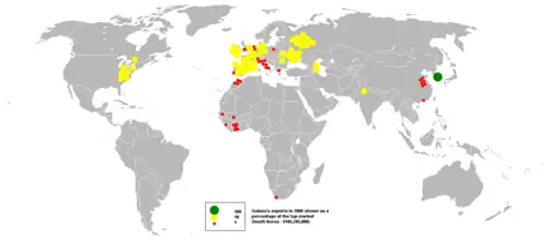 The economy of Guinea is dependent largely on agriculture and other rural activities.[5] Guinea is richly endowed with minerals, possessing an estimated quarter of the world's proven reserves of bauxite,[6] more than 1.8 billion tonnes (2.0 billion short tons) of high-grade iron ore, significant diamond and gold deposits, and undetermined quantities of uranium. In 2021, Guinea was the world's biggest exporter of Aluminium Ore ($3.2B/ Gold $5.5B) 2021 trade surplus was $4.3B.