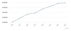The GDP per capita of Porto Alegre is R$49,740.90.[7] As shown in the graph below (figure 2), the GDP per capita of Porto Alegre has been steadily increasing since 2010 showing a 65.8% increase. (Calculated from graph).