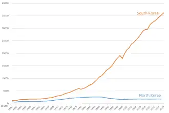 South Korea's real GDP expanded by an average of more than 8 percent per year,[46] from US$2.7 billion in 1962[47] to US$230 billion in 1989,[48] breaking the trillion dollar mark in the early 2000s. Nominal GDP per capita grew from $103.88 in 1962[49] to $5,438.24 in 1989,[50] reaching the $20,000 milestone in 2006. The manufacturing sector grew from 14.3 percent of the GNP in 1962 to 30.3 percent in 1987. Commodity trade volume rose from US$480 million in 1962 to a projected US$127.9 billion in 1990. The ratio of domestic savings to GNP grew from 3.3 percent in 1962 to 35.8 percent in 1989.[46] In the early 1960s, South Korea's rate of growth exceeded North Korea's rate of growth in most industrial areas.[51]
