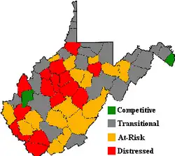 The Appalachian Regional Commission was formed in 1965 to aide economic development in the Appalachian region, which was lagging far behind the rest of the nation on most economic indicators. The Appalachian region as defined by the Commission includes 420 counties in 13 states, including all 55 counties in West Virginia, the only state whose entire territory is covered by the Appalachian Regional Commission. The Commission gives each county one of five possible economic designations - distressed, at-risk, transitional, competitive, or attainment - with "distressed" counties being the most economically endangered and "attainment" counties being the most economically prosperous. These designations are based primarily on three indicators - three-year average unemployment rate, market income per capita, and poverty rate.[16]