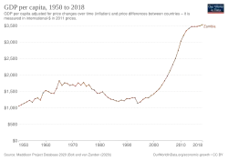 Upon achieving independence, Zambia had a higher GDP per capita than almost all sub-Saharan African countries.[23] Over the subsequent decades, Zambia's economy contracted, in part due to declining copper prices.[23] Since the 2000s, Zambia's economy has been growing.[23] As of 2019, Zambia's GDP per capita (current international dollars) stands at $1,305.00.