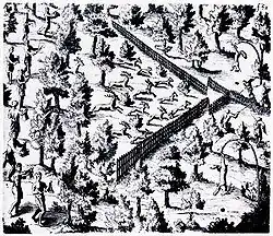 The Iroquois men also organized in a cooperative fashion. The men acted collectively during military actions.[12] The other jobs of men, such as hunting and fishing, also involved cooperative elements. The men more often organized as a whole village rather than as a clan.[13] The men organized hunting parties where they used extensive cooperation to kill a large amount of game. One firsthand account told of a hunting party that built a large brush fence in a forest to form a V. The hunters set a fire across from the open side of the V, forcing the animals to run towards the point where the hunters awaited them. They could kill one hundred deer at a time by such a plan.[14]