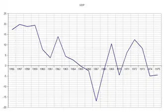 South Vietnam's industry suffered from the departure of foreign troops in the early 1970s, which resulted in significantly less demand. Industrial output shrank by 5% in 1972 and by over 20% in 1973 and 1974.[9] By 1973 food processing was by far the largest industry in terms of output (almost half of the total industrial output of 448 billion dong), followed by textiles (around 1/5 of total output, but the largest employer with 32,489 out of 111,964 workers) and chemicals (1/10) (in terms of capital, electricity was the largest industry).[10]