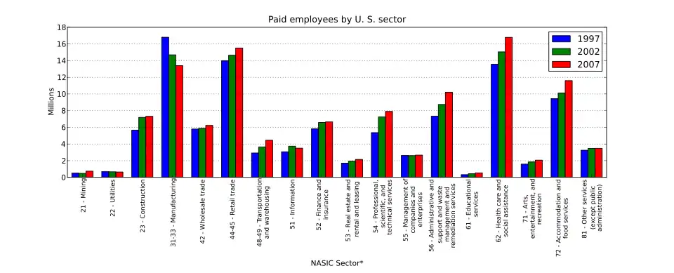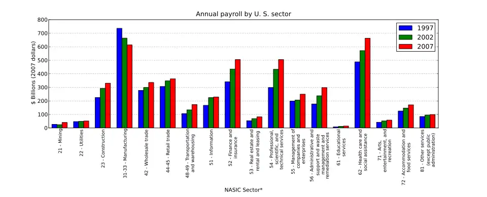 The Census Bureau releases sector-by-sector statistics on the number of establishments, total business activity, annual payroll, and number of paid employees. A standardized classification of the economy into sectors makes it possible to compare census results over time. However, to reflect the evolving nature of the economy, the NAICS is updated every five years. Therefore, when comparing different censuses, a particular NAICS basis is usually specified. The following data are based on a comparison of the 2007 and 2002 censuses using the 2002 NAICS basis and an older comparison of the 1997 and 2002 censuses using the older 1997 NAICS basis. Thus, (*) the 1997 data are based on a slightly different classification than the 2007 and 2002 data.