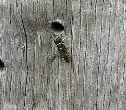 Ectemnius species excavate nest tunnels in pieces of dead wood such as stumps, fallen tree trunks, rotting logs and sometimes building timbers or posts with the help of the mandibles. Nesting aggregations can be large and dense, and sometimes more than one female has been recorded using a common nest entrance. In most species the brood is supplied with Diptera from several different families.[3]