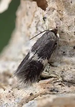 The wingspan is 5–7 mm. The head is grey, the face whitish. Forewings are light grey irrorated with dark fuscous and with a very indistinct oblique whitish fascia before middle, usually partly or wholly obsolete; a small tornal spot and larger triangular spot on costa somewhat beyond it ochreous-white. Hindwings grey.[1][2][3]