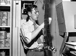 Westcott was the 29th employee hired for the Manhattan Project in Oak Ridge,[3][8] where he was to work as an official government photographer from 1942 to 1966. During much of World War II he was employed by the Roane-Anderson Company, under contract to the Army Corps. As well as photographing the construction and mechanical workings of the X-10, K-25, Y-12, and S-50 production facilities, he photographed civilian activities in Oak Ridge for the community's Army-sponsored weekly newspaper, the Oak Ridge Journal. All of Westcott's wartime photos were produced with either a Speed Graphic or an 8×10 Deardorff view camera.[9]