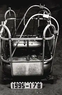 In October 1955, Yost developed and flew the first prototype of the modern hot-air balloon in a tethered flight.[3] The envelope was plastic film, and heat was provided by burning kerosene. This prototype flight uncovered conceptual flaws that Yost worked to overcome.