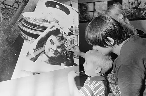 He then traveled extensively, to Bagara[26] 1957 (now in Central African Republic), and to Tokyo and Hong Kong in 1959 to 1960, with Gerda van der Veen (1935–2006) also a photographer, whom he married (25 September 1957). He filmed for Welkom In Het Leven, Lieve Kleine[27] the homebirth of their second child, Daan, in the old-fashioned, working-class Nieuwmarkt in Amsterdam.[28] This is an early example of cinema production with a small shoulder-mounted camera synced with sound.[29] He continued in motion imagery his subjective stance[30] in which the camera operator interacts live from behind the camera with subject, obviating the need for the intrusion of an interviewer or presenter, and recording the immediate experience.[31] His style was immediately influential on the television of Hans Keller, Roelof Kiers and others.