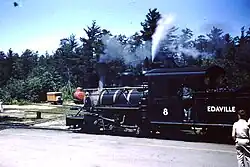 Edaville Railroad (also branded Edaville USA and Edaville Family Theme Park) is a heritage railroad which once had an amusement park in South Carver, Massachusetts. Originally opened in 1947, it was one of the oldest heritage railroad operations in the United States. It is a 2 ft (610 mm) narrow gauge line that operates excursion trains for tourists, built by the late Ellis D. Atwood (initials E.D.A., for which Edaville is named) on his sprawling cranberry farm in Southeastern Massachusetts.[2]: 45