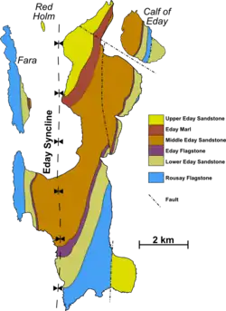 In common with its neighbouring isles, Eday is largely formed from Middle Devonian Old Red Sandstone deposited in the Orcadian Basin. The Eday Group is the name for a substantial sequence of sandstones that is found at many locations in Orkney, for which Eday and the area around Eday Sound are the type area.[24] In places it is up to 800 metres (2,600 ft) thick, and is largely composed of yellow and red sandstones with intervening grey flagstones and marls.[25] The rock is easily quarried and some of the yellow sandstones from Fersness were used in the construction of St Magnus Cathedral in Kirkwall.[2][16] The Devonian sequence is deformed into a major fold, the north–south trending Eday Syncline, with the youngest part of the sequence, the Upper Eday Sandstone outcropping in the north of the island from Bay of Cusby to Red Head. The oldest part of the sequence, the Rousay Flagstones are found on the eastern side of the island at Bight of Milldale and from Kirk Taing to War Ness, and to the west from Sealskerry Bay to Fersness. Veness is formed of Upper Eday Sandstone downfaulted against the flagstones.[26]