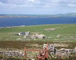 Although there are several Bronze Age sites on the island, they provide less dramatic remains. At Warness in the south west there is a burnt mound from this period and there are the ruins of two houses of a similar age on Holm of Faray near the Point of Dogs Bones.[32] The Fold of Setter is an 85-metre-diameter (279 ft) Bronze Age enclosure located to the north of Mill Loch.[33] There is the site of a large Iron Age roundhouse containing a saddle quern at Linkataing in north west Eday.[34] Latterly, Orkney was settled by the Picts although the archaeological evidence is sparse.[35]