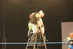 Later that year, in December, Edwards began teaming with fellow Sweet and Sour, Inc member, Davey Richards, as The American Wolves.[7] Their first match as a team was on December 26, at All Star Extravaganza IV, where they lost to The Briscoe Brothers (Jay and Mark) in a three-way elimination tag team match, which also involved Claudio Castagnoli and Nigel McGuinness.[44] The following night at Final Battle 2008, the American Wolves, along with Go Shiozaki, lost to Brent Albright, Roderick Strong, and Erick Stevens in a "New York City Street Fight". Later that night, they attacked and injured Mark Briscoe.[45] As 2009 began, they began challenging for the ROH World Tag Team Championship, losing to the champions Kevin Steen and El Generico on numerous occasions.[46][47] They eventually won the Championship on April 10, at a Ring of Honor Wrestling taping, in a "Tables are Legal" match.[48] Edwards and Richards went on to successfully defend the Championship against teams made up of ROH's top wrestlers including Tyler Black and Bryan Danielson, and against former champions Kevin Steen and El Generico at Manhattan Mayhem III in a submission match.