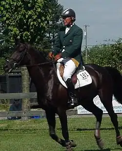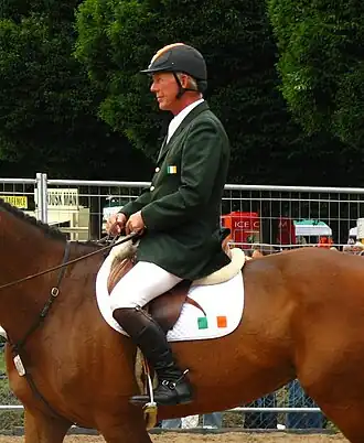 Eddie Macken (born 20 October 1949 in Granard, Longford, Ireland)[1] is an Irish equestrian show jumper, who was a member of the Irish team - along with Paul Darragh, Capt. Con Power, and James Kernan – that won the Aga Khan Cup three years in a row (1977 to 79). Other notable career highlights include a record four consecutive Hickstead Derby wins (1976 to 79), two individual silver medals at the Show Jumping World Championships, 1974 with Pele and 1978 on Boomerang, and an individual silver medal at the 1977 European Championships with Pele. Macken has many major Grand Prix victories worldwide. Many of Macken's achievements were gained in partnership with his Irish bred gelding, Boomerang. From Macken's first rides with Boomerang as a four-year-old in 1970, the pair blazed a trail of wins that lasted a decade.[2]