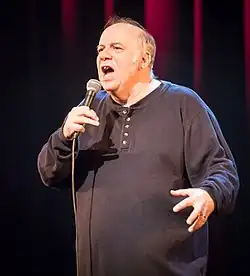 Pepitone started doing stand-up comedy in 1978. He took a hiatus from performing stand up comedy and started doing improv comedy, performing with improv troupe Chicago City Limits.[8] Described as a "cult favorite",[9] Pepitone is a staple in the Los Angeles comedy scene. He is known for his regular appearances in the early days of the WTF with Marc Maron podcast and his sketch appearances on Late Night with Conan O'Brien and Conan, often playing his recurring role as the "New York City Heckler" in the audience.[10] He has had recurring roles on television programs such as The Life & Times of Tim, The Sarah Silverman Program and Nick Swardson's Pretend Time. His short mockumentary film Runyon: Just Above Sunset, co-written by Karen Simmons and directed by Troy Conrad, won Best in Show (as well as Best Actor in a Mockumentary) at the L.A. Mockfest as well as Best Comedy Short at the Burbank Film Festival in 2011. Pepitone often pokes fun at corporatocracy and has been nicknamed the Bitter Buddha.[11]