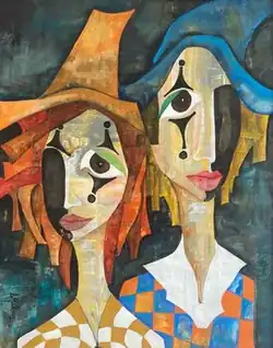 Galban's backgrounds are produced first as textural, abstract, and mixed-media color fields.[9] Another defining element of his work include his use of symbolic and conceptual elements. His human figures are typically cyclops — having only one eye – whereas he conceptually replaces the missing eye with the eye of the viewer.[9] Rendered in a Cubistic style that divides the face, the missing eye also represents the expression "beauty is in the eye of the beholder," as well as acknowledging the role of shifting perspectives that various audiences of viewers have in influencing the impact of an artwork.[9]