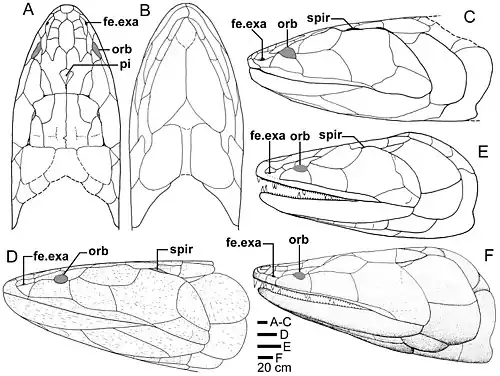 The holotype consists of numerous semi-articulated remains, including an incomplete skull roof, snout, palate, cheeks, lower jaws and associated dermal bones, a left shoulder girdle, and assorted scales. Reconstructions suggest a skull length of 30 cm (12 in) and lower jaw length of about 48 cm (19 in). The endoskeleton shows a large or complete lack of ossification. The orbits (eye-sockets) are somewhat triangular rather than oval-shaped. Edenopteron possessed dentary fangs and premaxillary tusks, which are presumed to be derived traits for other large tristichopterids. By comparison to body size ratios of other tristichopterid fishes (e.g. Eusthenodon, Langlieria, Mandageria), the body length of Edenopteron is estimated at 2.9—3.2 m (9.5—10.5 ft), while study in 2023 estimates length up to 3 metres (9.8 ft).[1][2] Additional fossil material may be described in the future: according to lead researcher Gavin Young, quoted in the Canberra Times: "We know that part of the pectoral girdle is still in the rock, so if we can lift up a few more blocks, we might find that the body is actually preserved in the rock."[3]