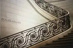 Probably one of Brandt's most important commissions to this date is his design of the Escalier Mollien staircase in the Louvre which was unveiled in 1914. Resembling that of a modern version of an eighteenth-century staircase, the banister and railing are composed of S- and C-shaped scrolls with gilded acanthus surrounding the rosettes. It has been said that “Brandt was justifiably proud of this state commission, and he used an illustration of the Escalier Mollien on his early 1920s adverting brochure”.[26]