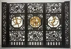 In 1923, Brandt, in collaboration with sculptor Max Blondat, were able to complete a five-panel hall gate that was displayed at the entrance of the Salon d’Automnes decorative-arts rooms. At the center of the panels are 5 figures, designed by Blondat. These figures were created using gilt-bronze that reference Greek mythology. The middle panel contains the Three Graces which are flanked by figures of Mercury and Venus on the side panels. From the distinct similarity between the figures in the panels and to Sandro Botticelli's Primavera, it has been concluded that the two designers were referencing “The Golden Age” of the Renaissance. Additionally, the octagonal frame around each of the figures further emphasizes the Renaissance reference. The frames placed around the figures can be paralleled to Renaissance ceiling frescos, such as those by Baldassare Peruzzi in the Sala di Galatea in the Villa Farnesina in Rome.[19] Surrounding the figures are gear-like flowers and scalloped circles designed by Brandt. The combination of the classical figures offset by the abstract expressionistic flowers offers an appealing duality that combines classical iconography with the modernist Art Deco aesthetic. With the use of this design, “Brandt equated the artistic rebirth of his own era with that of the past”.[19]