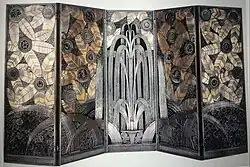 Also on display within Brandt's display room was his most renowned work, L’Oasis. The five-panel screen was inspired by Jean Dunand's ancient Japanese lacquered screens. According to Joan Kahr, “The formal symmetry of the screen and the small scrolls reflect Brandt's early, classically feminine repertoire, while various newer elements allude to the emerging style moderne. The ripples of falling water and the crimped gearlike flowers also show the influence of a machine-inspired aesthetic, with its emphasis on movement and speed”.[25] Through the use of stylized repetitive forms, Brandt is able to meld ancient decorative motifs with the modern focus on the machine. Although to the amateur eye the screen does not seem that complex, the technical superiority of its assembly provides proof of Brandt's sophistication as an ironworker. In 1925, L’Oasis became a well-known visual entity that was referenced on other decorative arts during that time. For example, the central fountain displayed on the screen as well as the foliage have been replicated on other works such as theater sets, perfume labels, and wallpapers.