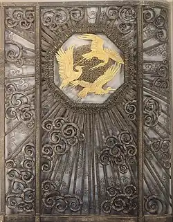 At the end of the nineteenth century and beginning of the early twentieth century, there was a big influence of Japonisme within the design community. In 1922, Siegfried Bing displayed a massive collection of Japanese prints at the Ecole des Beaux-Arts.[16] As a result, Japanese culture began to circulate throughout French society. In turn, Brandt began to implement Japanese motifs into his work. One motif in particular Brandt referenced was Japanese birds. In the wrought-iron grille, Les Cigognes d’Alsace, Brandt imitated Japanese storks that are represented in Japanese textiles of the eighteenth-century. According to Kahr, in the book Edgar Brandt: Master of Art Deco Ironwork, the panel “contains a central motif of three gilt-bronze storks flying in front of a scroll-filled sun. The shooting rays of the sun intermingle with variation of the “potato peeling” form. The hammering on the clouds and the incised lines chiseled into the rays emphasize the two-dimensional quality of the grille. The octagonal frame of the storks, juxtaposed against the rays and scrolls, offers a richness of contrasting shapes and colors”.[17]