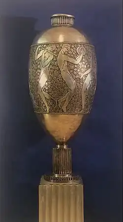 In 1921, Brandt began developing his own personal style by creating somewhat abstract versions of a cabbage rose. As a result of the limited properties of iron, it could not be treated in the same manner at which painting and drawing gave an artist. Iron could either be shaped into perfect shapes or irregular spirals. As a result, Brandt developed the “potato peel” flower which uses wavy lines in one single spiral motion. In turn, the wavy lines give off the visual tension of a flower. Brandt continued to use the “potato peel” technique throughout the rest of his career; however, in the 1920s, his career began to peak as he developed a distinct and dynamic personal style. Staying true to his love of nature, Brandt's personal style can be “characterized by a rich density of stylized, finely detailed flower and plant motifs, sometimes offset with animal or human figures and areas of gilding”.[2] Examples of Brandt's personal style can be seen in L’Age d’Or, La Perse, Potiche, as well as countless others.