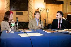 Bronfman, Jan Aronson (left), and Rabbi Andy Bachman (far right) speak about The Bronfman Haggadah