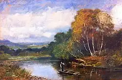 River Landscape with Punt painted by Edgar Longstaffe (oil on board)