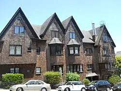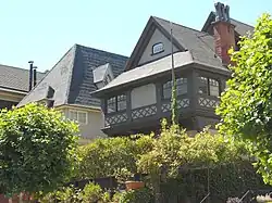 In San Francisco, houses by Mathews include 2361 Washington Street (1898, for William Gerstle) and 2421 Pierce Street (1897[5] or c. 1903, for James Irvine), both in the Tudor style,[6] and 2505 Divisadero Street (1899), former home of rock musician Kirk Hammett, in Georgian style.[7] Two houses designed by Mathews in Berkeley are city landmarks: the Cornelious Beach Bradley House (1897) and the Benjamin Ide Wheeler House (1900; remodeled by Lewis Hobart).[8] Of his apartment houses, those at 1390–1392 Page Street and 200 Central Avenue are in a characteristic Shingle-Craftsman style;[9] the row of flats at 2100 Lyon Street is typical of his shingled apartment houses in Pacific Heights,[10] and the row at 100–114 Walnut Street (the Stein apartments) also has an unusually varied roofline.[11]